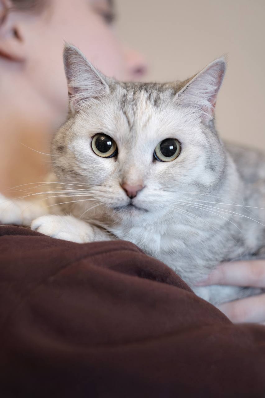 Если вы приходите реже, чем раз в неделю, мозг Букли честно классифицирует вас как потенциальную угрозу. Примерно в одной категории с громом, салютами и человеком с профессиональной камерой. Это не каприз и не плохая социализация, это нормально работающий механизм выживания.Несмотря на всё, со «своими» Букля ведёт себя совсем иначе. Она лежит рядом, вытягивает лапы, внимательно наблюдает, иногда подходит проверить контакт. Это тихая форма привязанности. Она не бросается в объятия, но остаётся поблизости, а для кошки это многое значит.